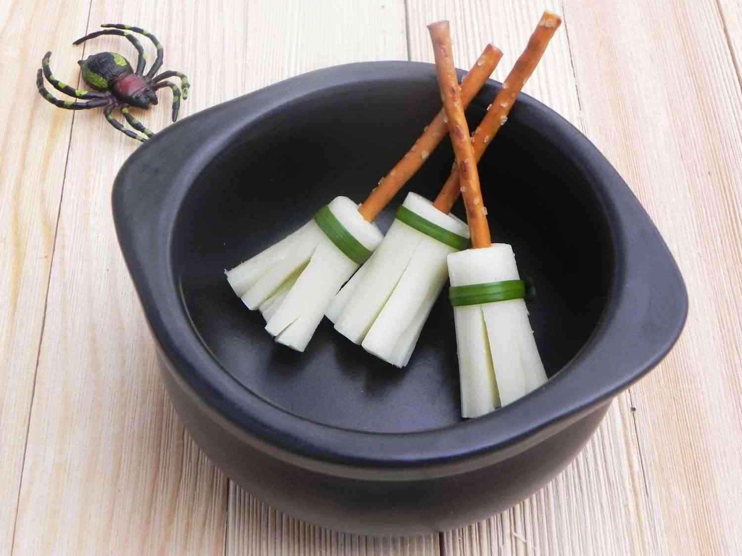 - Step 2:Place a pretzel stick into each piece of string cheese to create the broom handle. Tie a spinach strip around the cheese.