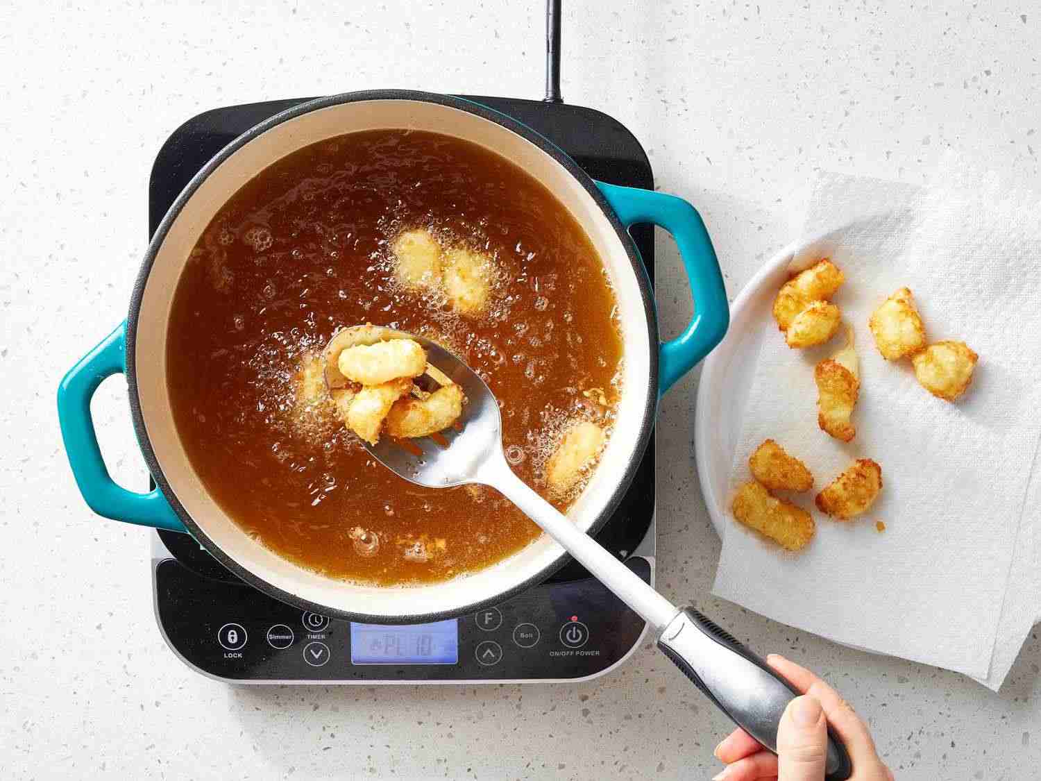 - Step 5:Deep fry curds in hot oil until golden brown, 1 or 2 minutes. Drain on paper towels; serve hot. Dotdash Meredith Food Studios