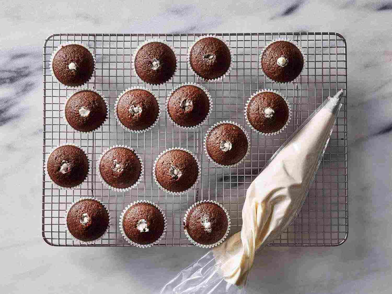 - Step 6:Once cupcakes have cooled, push tip through bottom of paper liner to fill each cupcake. Dotdash Meredith Food Studios